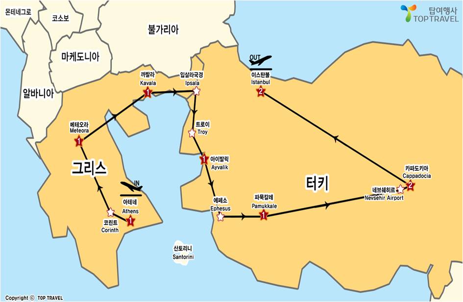 아테네 – 고린도 – 마테오라 – 카발라 – 입살라 – 아이발릭 – 에페소 – 파묵칼레 – 카파도키아 – 네브쉐힐 – 이스탄불